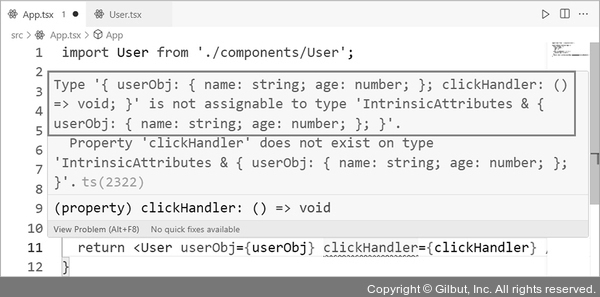 오류 메시지를 보면 Type ‘{ userObj: { name: string; age: number; }; clickHandler: () => void; }’ is not assignable to type ‘IntrinsicAttributes & { userObj: { name: string; age: number; }; }’.라고 나옵니다. 여기서 굵게 표시한 부분이 실제로 전달된 props 객체의 타입입니다. 이를 그대로 자식 컴포넌트의 매개변수 타입으로 지정하면 오류가 해결됩니다.