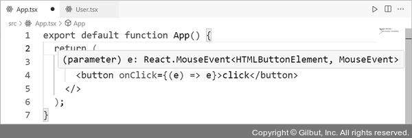 그리고 e에 마우스를 올리면 추론된 타입을 표시합니다. 그리고 e에 마우스를 올리면 자동으로 이벤트 객체의 타입을 추론해 보여줍니다.