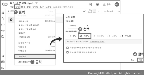 3. 추가 설정이 없을 경우 CPU 기반으로 구동됩니다. 빠른 실행을 위해 GPU 또는 TPU와 연결시켜 보겠습니다. 메뉴에서 ➊ 수정 > ➋ 노트 설정을 클릭한 후 하드웨어 가속기를 ➌ GPU(T4 GPU) 또는 TPU(TPU v2-8)로 선택하고 ➍ 저장을 누릅니다. 책에서는 T4 GPU를 선택했습니다.