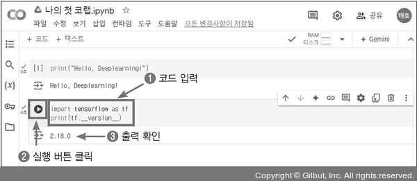 6. 딥러닝을 위해 반드시 필요한 라이브러리는 텐서플로입니다(텐서플로는 2장에서 자세히 설명합니다). 구글 코랩에는 텐서플로가 이미 설치되어 있습니다. 설치된 텐서플로의 버전을 확인하는 코드를 실행해 보겠습니다. 새로 연 코드 편집창에 다음과 같이 입력합니다.