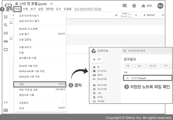 10. 구글 코랩에서 작성한 노트북 파일은 구글 드라이브에 저장됩니다. 메뉴의 ➊ 파일 > ➋ 저장을 선택한 후 ➌ 드라이브(내 드라이브 > Colab Notebooks 폴더)에 노트북 파일이 저장된 것을 확인합니다.