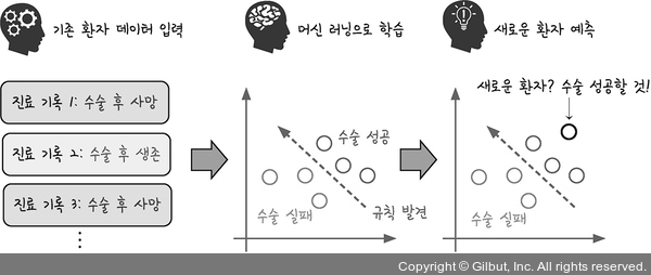 우리가 지금 배우려는 것이 바로 이러한 학습과 예측의 구체적인 과정입니다. 머신 러닝의 예측 성공률은 결국 얼마나 정확한 경계선을 긋느냐에 달려 있습니다. 따라서 더 정확한 선을 긋기 위한 여러 가지 노력이 계속되어 왔고, 그 결과 퍼셉트론(perceptron), 아달라인(adaline), 선형 회귀(linear regression) 등을 지나 오늘날 딥러닝이 탄생됩니다. 머신 러닝의 발전과 딥러닝 태동에 대해서는 7장에서 더 상세히 다루겠습니다.