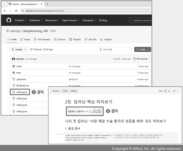 주피터 노트북으로 코드와 실행 결과를 먼저 확인한 후 구글 코랩으로 이동하려면, 저자 깃허브에 접속하여 그림 2-4의 ➊ 화면 상단 목록에 있는 ch02.ipynb를 클릭한 후 열린 주피터 노트북 상단의 ➋ 코랩에서 실행하기 이미지를 클릭합니다.