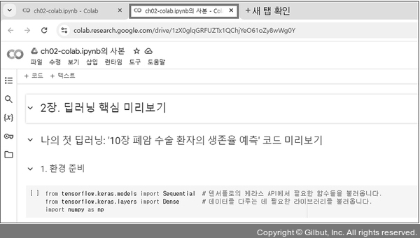 4. 새 탭이 열리며 해당 코드의 사본이 실행되는 것을 확인합니다. 이 사본은 나의 구글 계정에서 실행되는 것이므로 이제 코드를 내가 실행하거나 저장할 수 있습니다.
