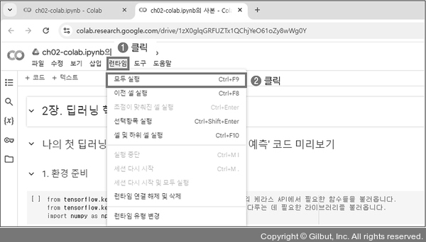 5. 구글 코랩 파일 전체를 한 번에 실행하려면 ➊ 런타임 > ➋ 모두 실행을 선택합니다.