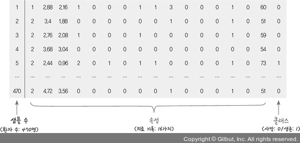 그림 2-13 | 폐암 수술 환자의 의료 기록과 1년 후 사망 여부 데이터