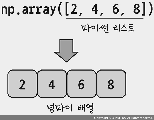파이썬에서 리스트는 대괄호([ ])로 감싼 요소들을 쉼표(,)로 구분해 대입하여 만듭니다. np.array() 함수를 사용하면 파이썬 리스트를 넘파이 배열로 바꾸어 여러 가지 계산을 수행할 수 있습니다.