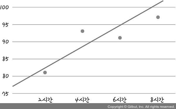 먼저 대강 선을 그어 보기 위해 기울기 a와 y 절편 b를 임의의 수 3과 76이라고 가정해 보겠습니다. y = 3x + 76인 선을 그려 보면 그림 4-6과 같습니다.