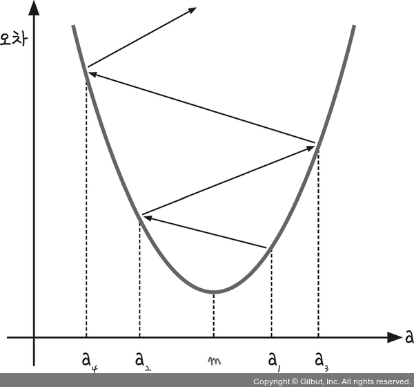 여기서 우리는 학습률(learning rate)이라는 개념을 알 수 있습니다. 기울기의 부호를 바꾸어 이동시킬 때 적절한 거리를 찾지 못해 너무 멀리 이동시키면 a 값이 한 점으로 모이지 않고 그림 5-4와 같이 위로 치솟아 버립니다.