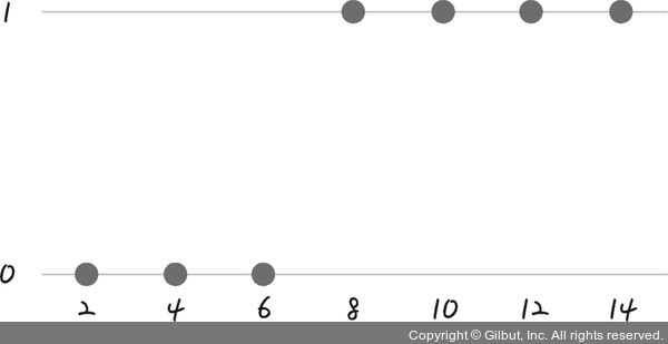 앞 장에서 배운 대로 선을 그어 이 점의 특성을 잘 나타내는 일차 방정식을 만들 수 있을까요? 이 점들은 1과 0 사이의 값이 없으므로 직선으로 그리기가 어렵습니다.