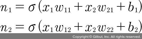 은닉층에 취합된 값들은 활성화 함수를 통해 다음으로 보내는데, 만약 앞서 배운 시그모이드 함수(σ(x))를 활성화 함수로 사용한다면 n1과 n2에서 계산되는 값은 각각 다음과 같습니다.