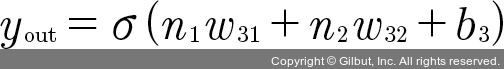두 식의 결괏값이 출력층의 방향으로 보내어지고, 출력층으로 전달된 값은 마찬가지로 활성화 함수를 사용해 y 예측 값을 정하게 됩니다. 이 값을 yout이라고 할 때 이를 식으로 표현하면 다음과 같습니다.