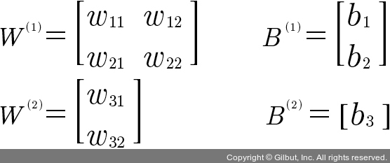 이제 각각의 가중치(w)와 바이어스(b) 값을 정할 차례입니다. 2차원 배열로 늘어놓으면 다음과 같이 표시할 수 있습니다. 은닉층을 포함해 가중치 여섯 개와 바이어스 세 개가 필요합니다.