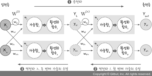 먼저 ➊처럼 한 번의 순전파가 일어납니다. 이 과정을 통해 각 가중치의 초깃값이 정해집니다. 이 초깃값의 가중치로 만들어진 값과 실제 값을 비교해 출력층의 오차를 계산합니다. 목표는 이때 계산된 출력층의 오차를 최소화시키는 것입니다. 이를 위해 ➋ 첫 번째 가중치를 수정하는 과정과 ➌ 두 번째 가중치를 수정하는 과정이 이어집니다.
