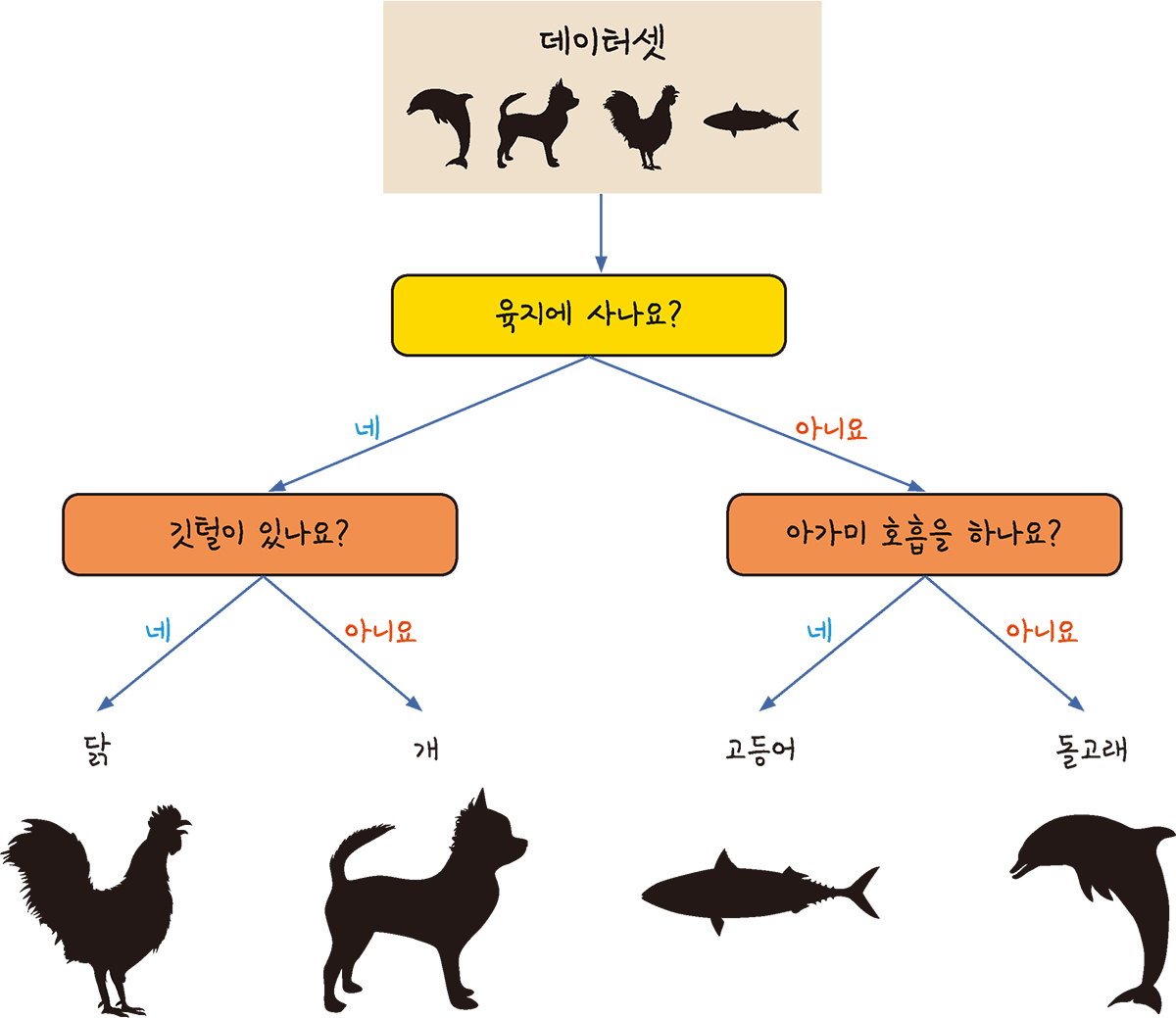 결정 트리(decision tree)는 ‘예/아니요’라는 답이 나오는 질문을 계속해서 물으며 학습하는 방법입니다. 주어진 데이터에 대해 각각 닭, 개, 고등어, 돌고래로 분류하는 과제가 있을 때 결정 트리 학습 방법은 주어진 데이터를 잘 구분할 수 있는 질문을 던져 다음 그림과 같이 정답을 찾아갑니다.