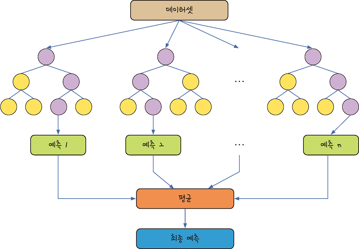 랜덤 포레스트(random forest)는 앞서 배운 결정 트리를 여러 개 묶어 놓은 것입니다. 트리(tree)를 묶어 놓았으니 포레스트(forest)라는 이름이 붙었지요. 하나의 결정 트리가 아닌, 많은 수의 결정 트리를 실행해 그로부터 나온 분류 결과를 취합해서 최종 예측을 하는 알고리즘입니다. 너무 단순한 원리로 인해 과적합에 빠지기 쉬운, 결정 트리의 단점을 보완해 줍니다.