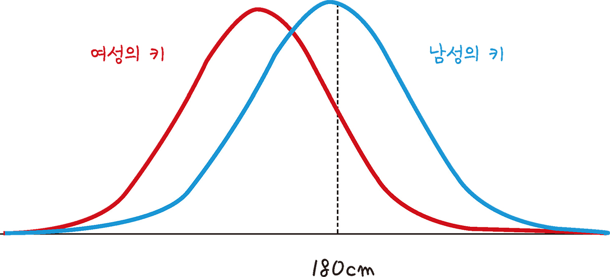 가우시안 나이브 베이즈( gaussian naïve bayes)는 속성이 연속형 변수일 때, 베이즈 정리를 기반으로 각 범주에 속할 확률을 계산하는 방법입니다. 키를 측정한 데이터를 보고 남성인지 여성인지를 예측하는 문제가 있다고 합시다. 남성의 키와 여성의 키는 자체 평균과 표준편차 값이 있으므로 다음 그림과 같이 분포될 것입니다. 이때 목표 데이터가 각 범주에 속할 확률을 계산하고, 가장 높은 확률을 가지는 범주로 데이터를 분류합니다.