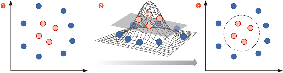 서포트 벡터 머신 - RBF 커널(support vector machine using radial basis functions kernel)은 주어진 데이터가 선형으로 분리될 수 없는 경우를 해결하기 위해 만들어졌습니다. ➊처럼 데이터가 분포되어 있을 경우 선으로는 빨간 점과 파란 점을 분리시킬 수 없습니다. 하지만 ➋처럼 3차원 공간을 이용하면 가능해집니다. 커널이란 주어진 데이터를 고차원의 공간으로 새롭게 위치시켜 주는 방법입니다. RBF(방사형) 커널을 이용하면 ➌처럼 주어진 점들을 분리할 수 있습니다.