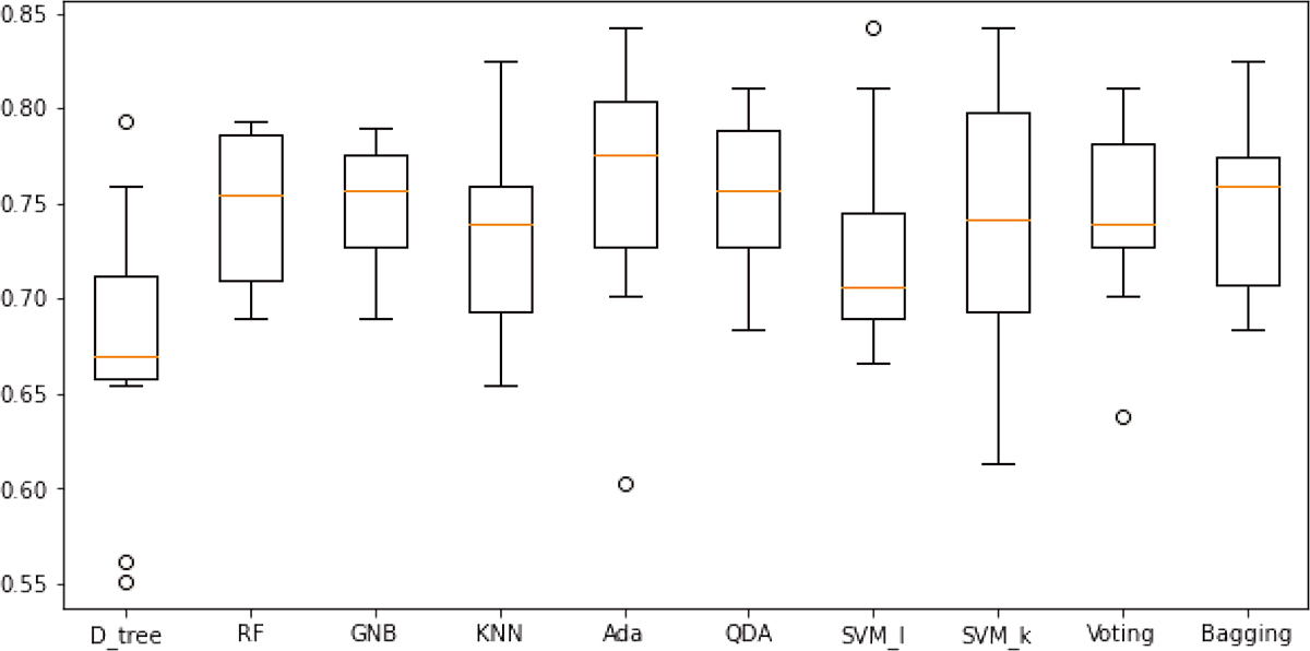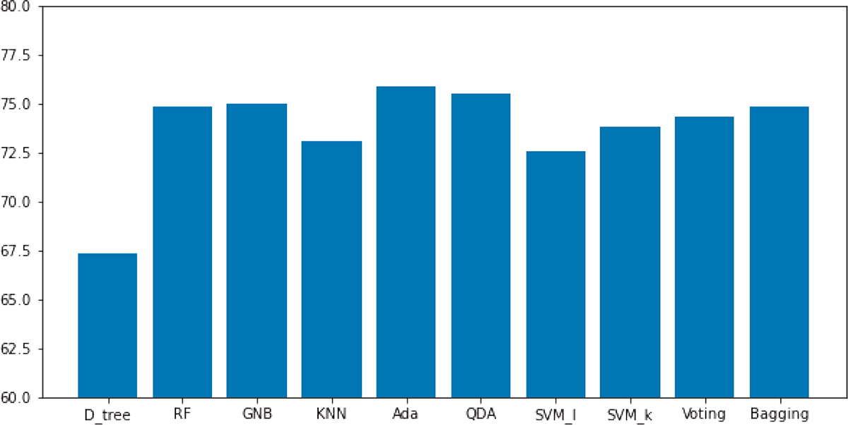 Mean accuracy of D_tree : 67.35 % Mean accuracy of RF : 74.83 % Mean accuracy of GNB : 75.00 % Mean accuracy of KNN : 73.11 % Mean accuracy of Ada : 75.88 % Mean accuracy of QDA : 75.50 % Mean accuracy of SVM_l : 72.58 % Mean accuracy of SVM_k : 73.80 % Mean accuracy of Voting : 74.30 % Mean accuracy of Bagging : 74.82 %