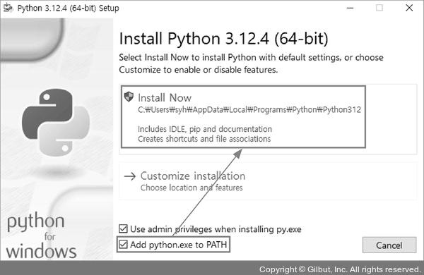 1 내려받은 설치 파일(python-3.12.4-amd64.exe)을 더블클릭합니다. 설치 시작 화면이 나오면 Add python.exe to PATH에 체크하고 [Install Now]를 클릭합니다. Add python.exe to PATH 옵션을 선택하면 파이썬의 설치 위치가 시스템에 등록돼 컴퓨터 내 어떤 폴더에서든 파이썬을 실행할 수 있습니다.