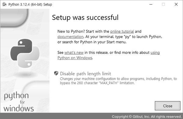 설치가 진행되다가 다음과 같은 완료 화면이 뜨면 [Close] 버튼을 클릭해 종료합니다.