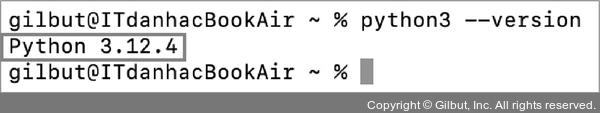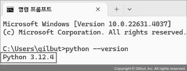 윈도우에서는 명령 프롬프트에 python --version을 입력한 후 Enter를 누르고, 맥OS에서는 터미널에 python3 --version을 입력한 후 Enter를 누릅니다. 방금 설치한 파이썬 버전(Python 3.12.4)이 나오면 제대로 설치된 것입니다.