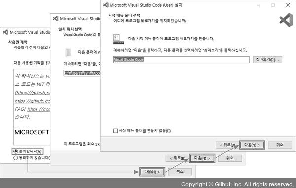 1 내려받은 설치 파일(VSCodeUserSetup-x64-1.98.2.exe)을 더블클릭합니다. 사용권 계약 화면에서는 동의합니다를 선택하고 [다음] 버튼을 클릭합니다. 이어지는 설치 위치 선택, 시작 메뉴 폴더 선택 화면에서는 기본 설정을 그대로 두고 [다음] 버튼을 클릭합니다.