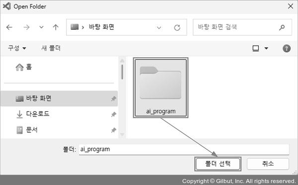 VSCode로 돌아와 File→Open Folder 메뉴를 선택한 후, 방금 만든 바탕화면의 ai_program을 선택하고 [폴더 선택] 버튼을 클릭합니다.