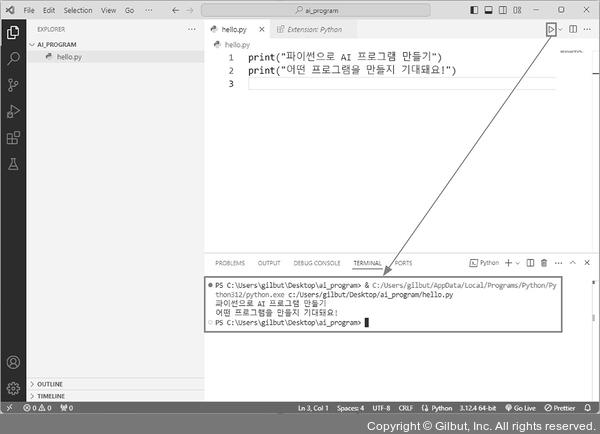 두 번째 장점은 코드 편집기 오른쪽 상단에 있는 실행 아이콘(▷)으로 코드를 실행할 수 있다는 것입니다. 이 아이콘을 사용하면 터미널에 명령어를 입력하지 않고도 코드를 실행할 수 있습니다.