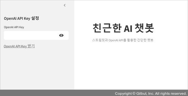 OpenAI API Key를 입력할 수 있는 입력 위젯이 사이드바에 구현돼 다음과 같이 웹 브라우저에 표시됩니다.