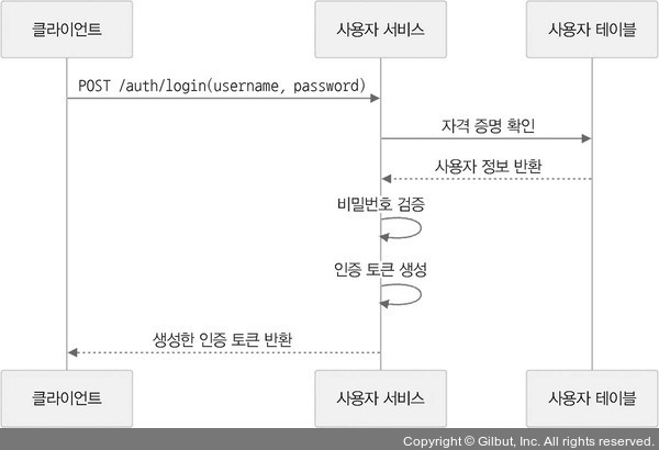 다음 그림은 사용자 인증 과정, 즉 자격 증명 확인과 토큰 생성 과정을 나타냅니다.