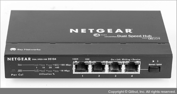 허브(hub)는 컴퓨터 여러 대를 연결하는 장치로, 여러 콘센트를 꼽을 수 있는 멀티탭처럼 컴퓨터를 여러 대 연결해 컴퓨터끼리 데이터를 주고받을 수 있게 합니다. 뒤에서 다루겠지만 허브는 스위치라는 장치가 등장하기 전까지 활발히 쓰였으며 스위치가 나온 이후로는 보기 힘든 장치가 됐습니다.