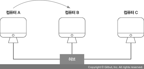 이 과정을 그림을 보면서 설명하겠습니다. 세 컴퓨터 A, B, C가 다음과 같이 연결됐을 때 컴퓨터 A에서 컴퓨터 B로 데이터를 전송한다고 합시다.