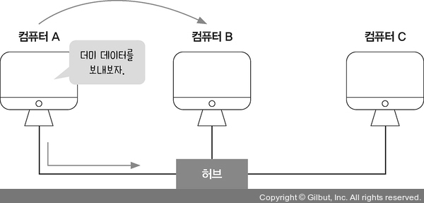 컴퓨터 A는 현재 연결된 네트워크가 비어 있는지 확인합니다. 이를 위해 의미 없는 비트 패턴으로 구성된 더미 데이터(dummy data)를 네트워크로 보냅니다.