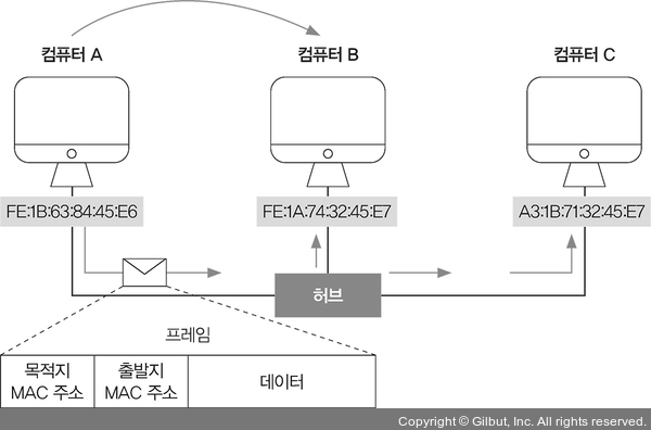 LAN에서 데이터를 주고받을 때는 프레임(frame)이라는 전송 단위를 사용합니다. 프레임은 택배 상자와 같아서 전송할 데이터뿐만 아니라 목적지와 출발지의 MAC 주소 정보를 담고 있습니다.