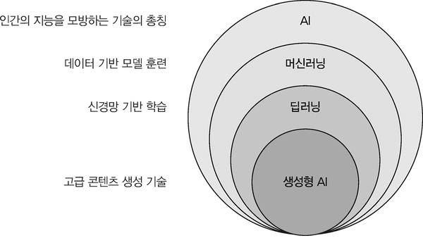 최근 몇 년 동안 AI는 우리 일상 속으로 깊이 스며들었습니다. 텍스트를 생성하는 챗GPT(ChatGPT), 이미지를 만들어 내는 달리(DALL-E), 음성 인식을 활용한 가상 비서 서비스 등 다양한 생성형 AI 기술이 실생활 여러 영역에 활용되고 있습니다. 사용자의 요구에 맞춰 콘텐츠를 생성하는 기술인 생성형 AI는 인공지능과 같은 개념일까요? 생성형 AI는 인공지능의 한 분야로, 머신러닝, 딥러닝과 계층 구조를 이루고 있습니다. 이를 그림으로 표현하면 다음과 같습니다.
