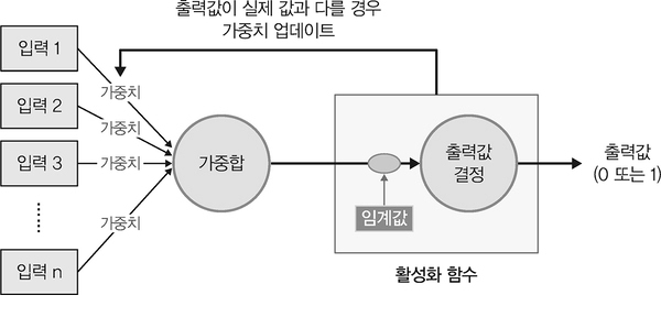 4. 가중치 업데이트: 출력값이 실제 값과 다를 경우, 그 차이를 기반으로 가중치를 수정합니다.