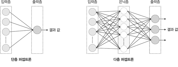 ▲ 그림 1-11 단층 퍼셉트론과 다층 퍼셉트론