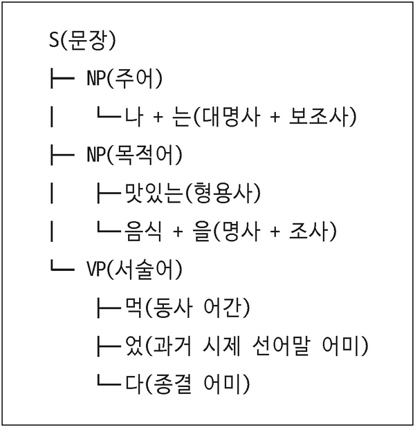 구문 분석(syntactic parsing)은 문장에서 단어 간 문법 관계와 구조를 분석하는 과정입니다. 이를 통해 주어, 서술어, 목적어 등 문장의 구조를 체계적으로 분석해 문법적 관계를 명확히 파악할 수 있습니다. 예를 들어 입력한 문장이 “나는 맛있는 음식을 먹었다”일 경우 구문 분석을 하면 다음과 같습니다.