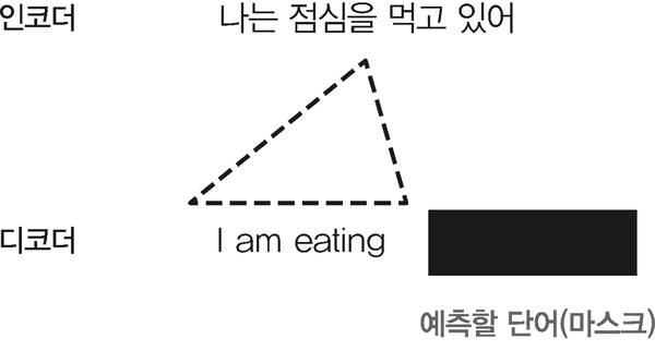 세 번째 단어 eating을 생성할 때 디코더는 I와 am을 참고해 예측하지만, lunch는 참조하지 못하게 마스킹됩니다.