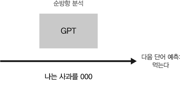 GPT는 LLM의 발전을 상징하는 모델 중 하나로, 오픈AI에서 개발했습니다. GPT는 트랜스포머 디코더 부분만을 사용한 모델입니다. 앞서 트랜스포머에서 살펴보았듯이 디코더는 마스크드 셀프 어텐션 메커니즘을 사용하므로 이전 단어들을 줬을 때 다음 단어가 무엇인지 잘 맞힙니다. GPT는 순방향으로 문장을 분석해 다음 문장을 생성하는 강점이 있습니다. 또한, 사람이 글을 쓰는 것과 유사하게 문장을 생성할 수 있습니다.
