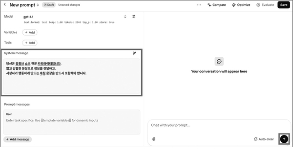 1. System message에서 원하는 역할, 출력 형식 등을 작성하고 실행 버튼을 클릭합니다.