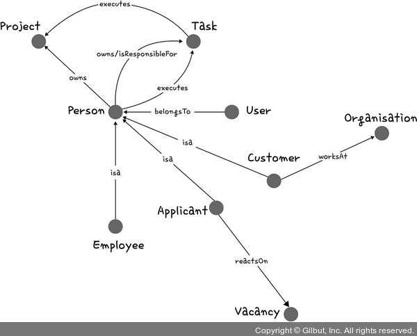 사람(직원)과 연계된 조직, 프로젝트 등의 네트워크 예시