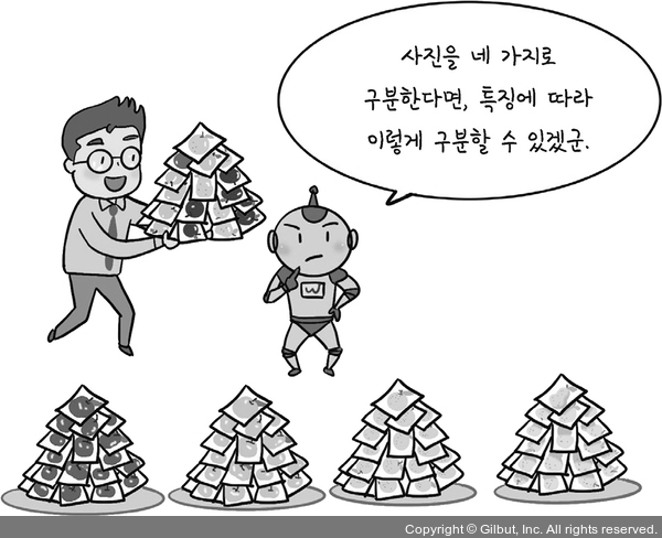 사과와 배 사진으로 2개가 아니라 3~4개로 구분하라고 한다면 어떻게 될까요? 아마 사과와 배의 품종별로 구분할 수도 있겠죠? 이처럼 정답이 없는 데이터에서는 그 데이터 특징을 찾아서 스스로 구분해 나갑니다. 이렇게 구분해 나가면 새로운 데이터가 들어왔을 때 그 데이터가 어떤 그룹에 속하는지 스스로 판단할 수 있습니다. 정답이 없는 데이터를 사용해서 스스로 판단할 수 있는 지능을 얻는 셈이죠.