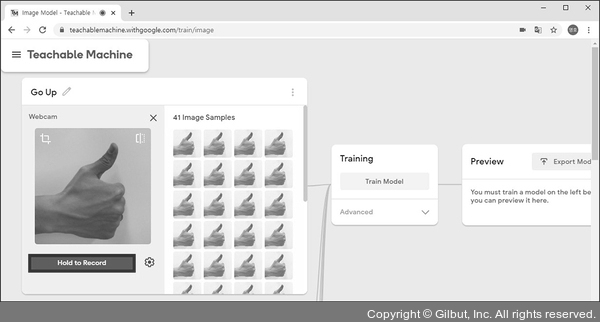 5 웹캠이 실행되면 Hold to Record를 클릭하여 사진 데이터를 넣습니다. 다음 그림과 같이 Go Up 모양의 손동작을 만든 후 웹캠에 잘 나오도록 자리를 잡아 보세요. 여러 장의 사진 데이터를 넣으려면 Hold to Record를 2~3초간 클릭하고 있으면 됩니다. 이것이 바로 Go Up 레이블에 해당하는 데이터를 생성하는 과정입니다.