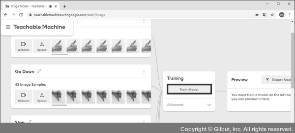 10 다음으로 인공지능 모델을 학습시키고자 Train Model을 클릭합니다. 티처블 머신이 각 레이블과 그에 해당하는 사진 데이터를 사용하여 학습을 시작합니다.