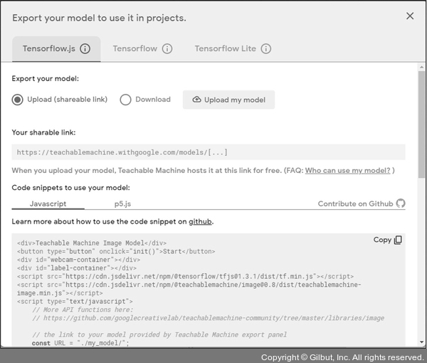 인공지능 모델 학습을 시킨 후 Export Model을 하면 이 작업을 할 수 있습니다. 티처블 머신에서 만든 모델은 텐서플로와 텐서플로.js, 텐서플로 lite에서 사용할 수 있습니다.