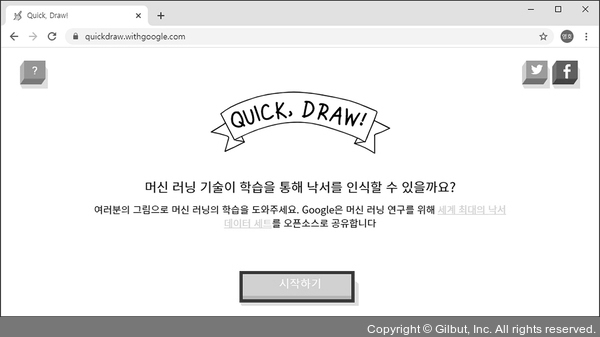 1 검색 창에 ‘퀵 드로우’ 또는 ‘Quick Draw’라고 입력해서 퀵 드로우 웹 사이트(https://quickdraw.withgoogle.com)에 접속한 후 시작하기를 클릭합니다.