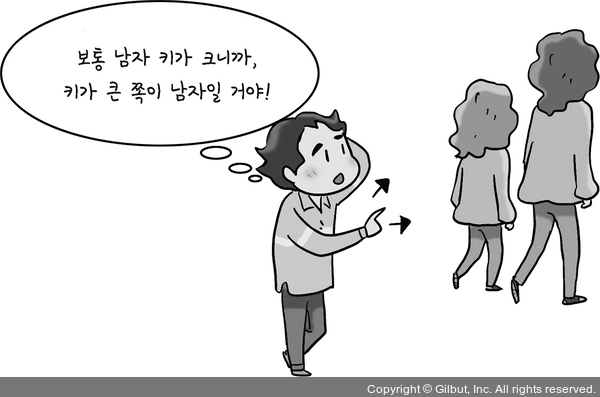 예를 들어 볼까요? 우리가 남자와 여자를 구분하는 상황 1을 생각해 봅시다. 이때 남자와 여자를 단번에 구분할 수 있는 방법은 없을까요? 물론 여러 방법이 있지만 키를 이용해서 구분해 볼 수 있습니다.