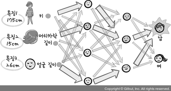 우리는 머신러닝의 다양한 방법 중 인공 신경망에 초점을 맞추어 살펴볼 텐데요. 인공 신경망 방식으로 만든 인공지능에서는 입력한 데이터가 여러 레이어를 지나가면서 특정한 신호로 전달됩니다. 그러면 최종적으로 남자와 여자 둘 중 어느 쪽으로 신호가 많이 가는지를 살펴본 후 신호가 많이 간 쪽 성별이라고 판단을 내리는 것입니다.